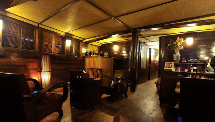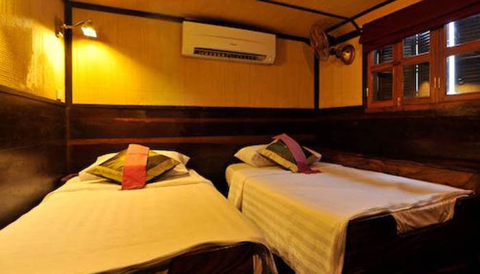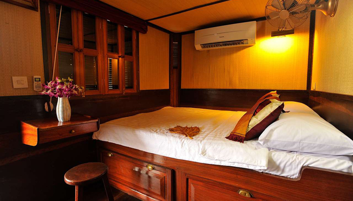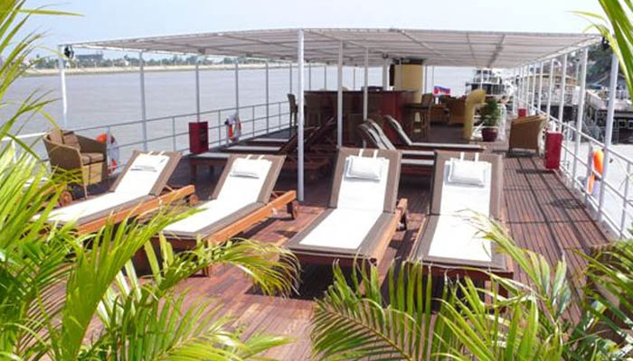 Fully-paneled in wood, with charm and comfort in mind, we designed it in keeping with the local style. Modestly sized and with the safety of a steel hull, its low draft makes possible an access to the smallest and remotest of villages. With the tasteful decoration of a bygone era, the Toum Tiou has 10 cozy double cabins with private shower, a large lounge area, a panoramic viewing space to the front, a half-covered bar-restaurant to the rear and a roof patio. Air conditioning, hi-fi system and library are provided. The captain, ship hands, hostesses, cooks and purser are discreet and inconspicuous in the performance of their duties. This traditional locally built boat started out as a freighter with a metal hull and a capacity of 150 tons, with two large but low-ceiling decks in order to maximize storage space. Like all ships of this type, it went up and down the Tonle Sap and Mekong, stopping at Siem Reap, Kompong Cham, Kratie and Stung Treng. We stayed as close as we could to the original line of the ship, because we wanted to retain its slightly curved and elegant lines. The Toum Tiou measures 38 meters long and 7 meters wide in the middle. It has 10 rooms in all (3.3m x 2.5m), 4 on the main deck and 6 on the upper deck, each air-conditioned and with a bathroom (2.5m x 1.4m) including toilet, shower and sink. The water on board is taken from the river, passed through a powerful filtration system and chlorinated in the final step of the treatment. In order to make the best possible use of the common areas from the standpoint of both size and variety, we have installed a library-reading room on the lower deck. There is also a covered space at the front of the middle deck, a restaurant to the rear and half-covered sundeck on top.